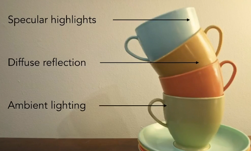 上图展示了一个简单的光照场景,我们可以看到几个叠放在一起的杯子,而杯子上呈现出了几种不同的光照表现。