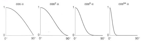 参考下图,我们会发现用余弦函数衡量重合程度存在问题,例如我们的半程向量与法向量偏差达到45°时,其余弦值仍旧较大,但实际上此时高光应该已经几乎不存在了。