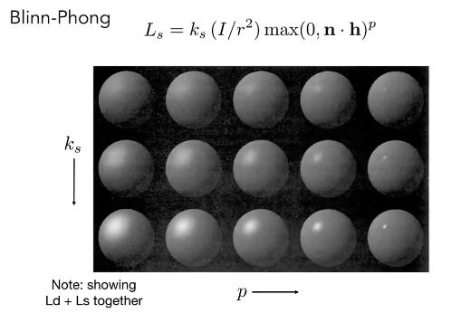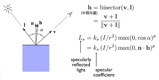 - $k_s$:镜面反射系数,表示着色点对能量的吸收能力