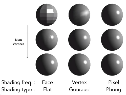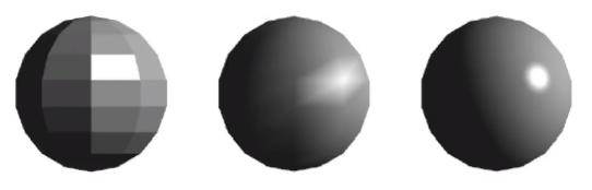 上图左的圆球在每个小平面上对整个面应用了着色,也就是说同一个面上的颜色都是相同的;图中的球对于更多的顶点着色,然后使用插值计算剩余的部分,因此看上去更加细腻 ;图右对每个像素都进行着色,自然最为真实。