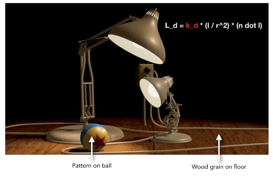 $k_d$:漫反射系数,表示着色点对能量的吸收能力,如果使用三维向量,就能表示颜色