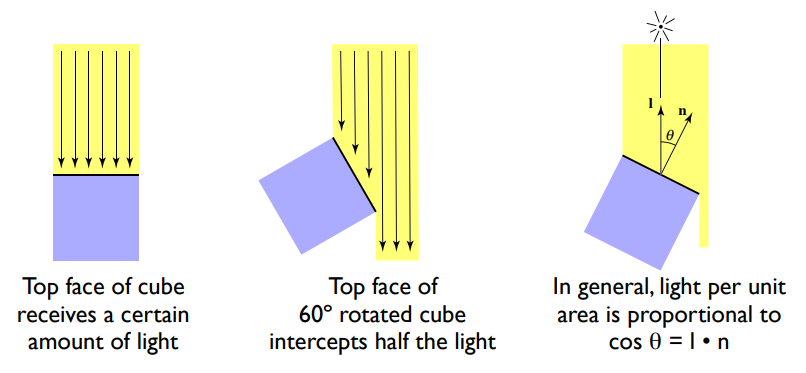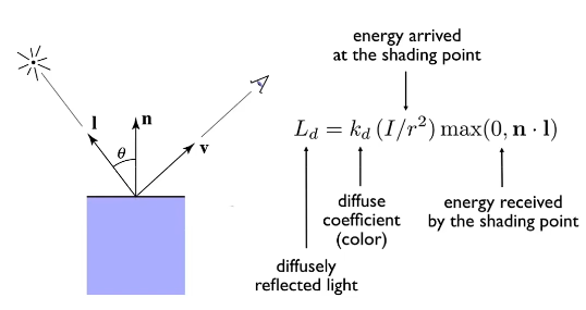 - 着色点接收到的能量与入射角$\theta$的余弦值成正比。