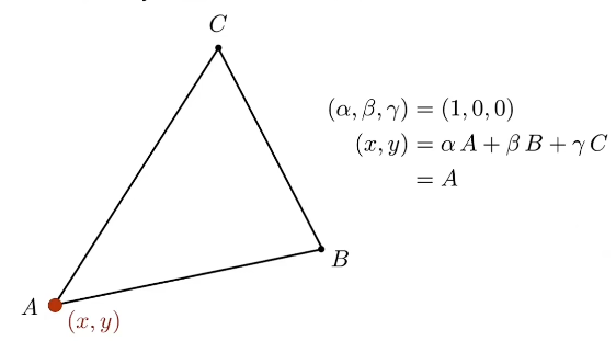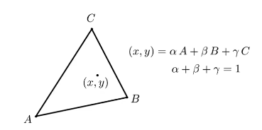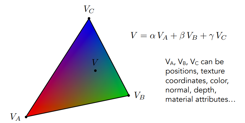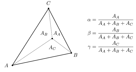 Gouraud shading是依据顶点来进行着色的方法,它对于每个三角面的顶点进行着色,区域部分使用插值的方法来进行计算,如下图所示: