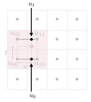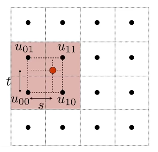 对于一个像素点,我们可以取它临近的四个点,构成一个正方形,再计算出该像素点到左和下两条边的距离$s$与$t$。