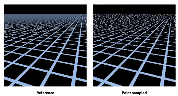 当我们将一个很大的纹理应用到模型上时,可能会出现下图中展示的问题:远处的直线变成了混乱的纹路,近处的直线出现了严重的锯齿。