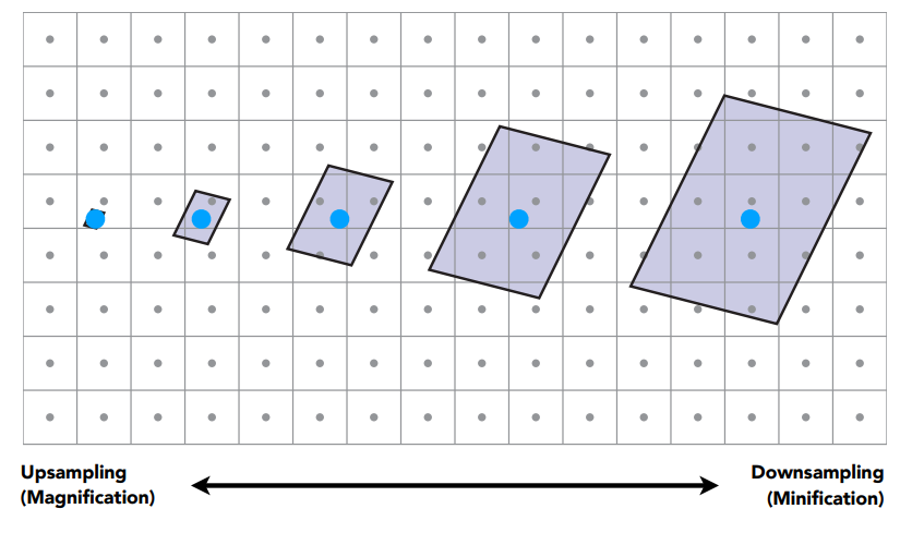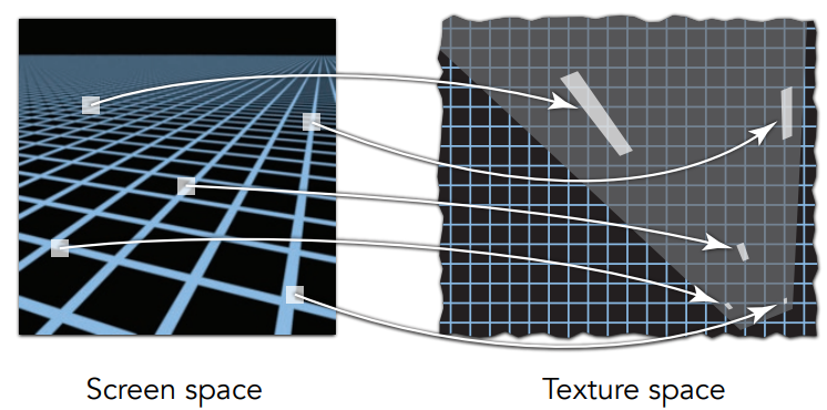原因在于,对于远近不同的物体,一个像素所代表的实际大小不同。对于距离较近的部分,一个像素覆盖的区域可能远小于一个纹素的区域,反之,对于远处的部分,一个像素就可能覆盖很多个纹素,下图就说明了这一过程。