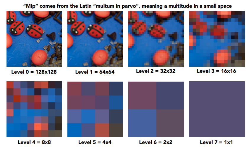 在Mipmap中,我们用Level来表示各种尺寸的纹理,Level 0通常表示原始纹理,Level每高一级,纹理的尺寸就会缩小一倍(面积缩小为1/4)。