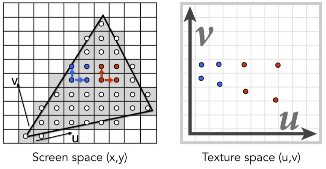 假设在屏幕坐标系下有一个像素(图左,左下角红点所在的像素),现在要求它对应的Mipmap层级。