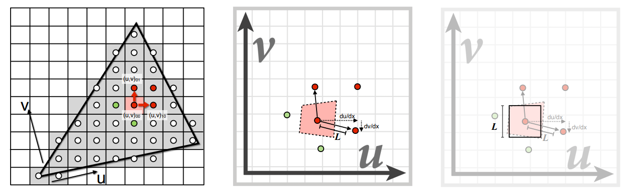 我们可以取该像素中心点,以及周围的几个像素中心点,把它们一起映射到纹理空间中,如下图右所示: