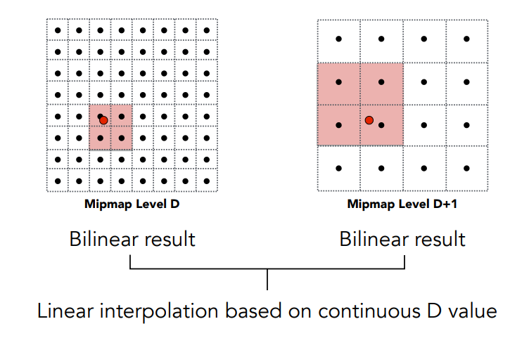 不过我们现在已经有解决这类问题的办法了,那就是之前屡屡提到的插值计算。对于计算出层级为非整数的情况,我们可以一并计算其上下两个层级,再进行一次线性插值,如下图所示: