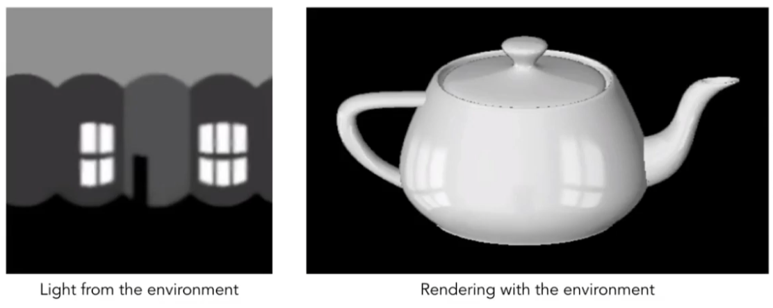 下图展示的例子是一个经典模型——犹他茶壶,左图的纹理上记录了周围的环境光照,当把这张纹理渲染到茶壶上后,就营造出了光线照射到茶壶表面,形成反射的效果。