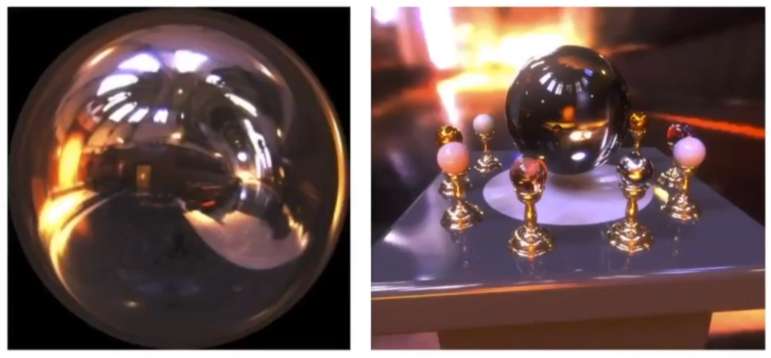 具体而言,就是想象有一个镜面球体放在环境中央,这个球体上呈现出来的内容就能够看作是一个环境贴图,这种方法就是Spherical Environment Map。