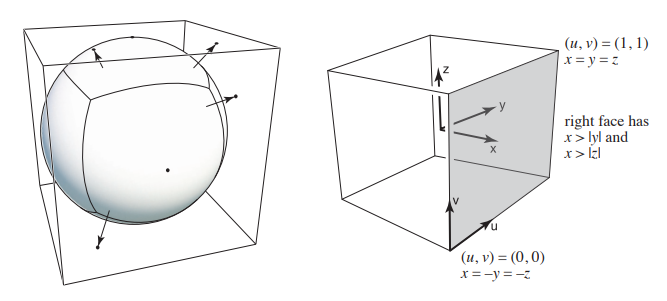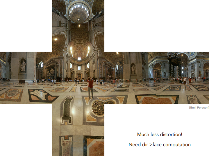 像图中示意的一样,原本落在球面上的点回到了立方体的规则平面上,这样扭曲现象就会大大减少。