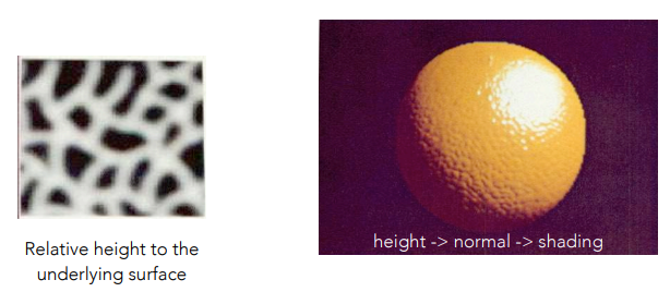 上图中我们对一个球体使用左边的相对高度贴图。注意,是一个球体,其表面是光滑的曲面,但通过相对高度贴图,我们能让它看上去像是拥有了极粗糙的表面。