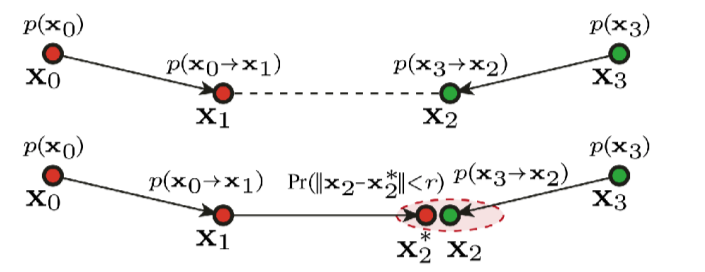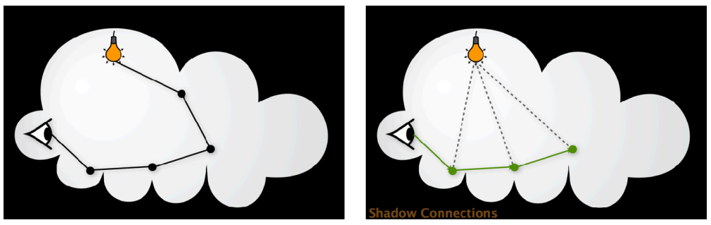 上图给出了这个方法的大致示意图,上面那张表示BDPT的过程,在BDPT中,我们先生成半路径,再寻找连接点。