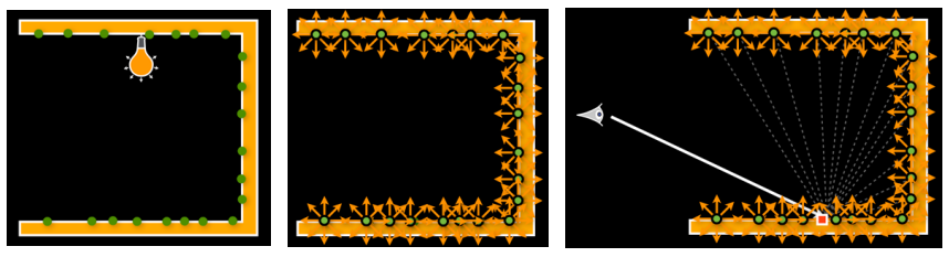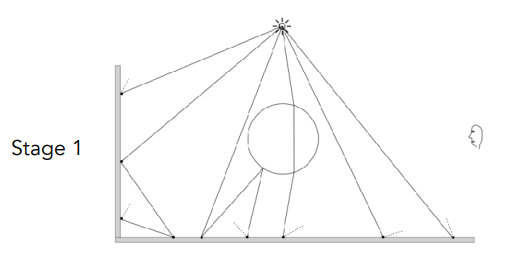 首先来看第一阶段,在这个阶段,我们从光源出发,向外射出光子,正常进行反射和折射。不过一旦接触到Diffuse表面,我们就记录这个位置,认为该地方留下了一颗光子,如下图所示: