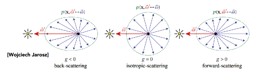 这里散射可就不是像漫反射一样的均匀散射了,为了定义该散射,引入了Phase Function(相位函数)来描述它,如下: