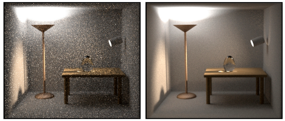 MLT的缺点在于难以估计其收敛的时间,而且由于其局部特性,从每个种子向外扩散,因此收敛不一定均匀,一定程度上会导致画面变”脏“(上图),所以MLT通常不会被用来渲染动画。