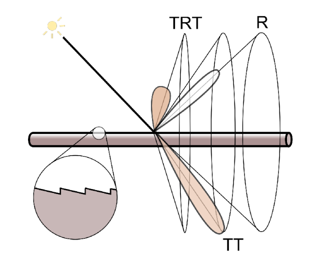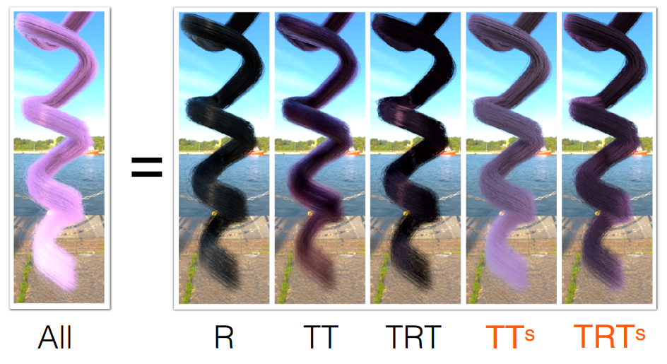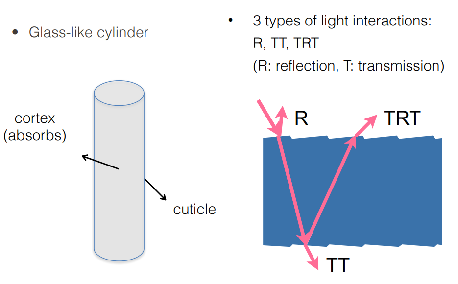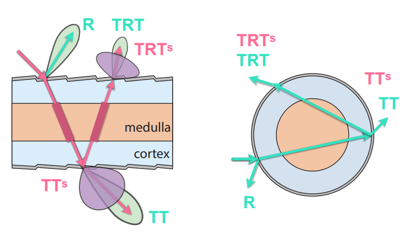 该模型中,光线会考虑TT和TRT两种情形,前者指的是光线进入头发,产生一次折射(T),再从头发传出,产生第二次折射(T);后者指的是光线进入头发,产生折射(T),触碰到对侧头发壁厚,发生反射(R),最后再折射出去(T)。