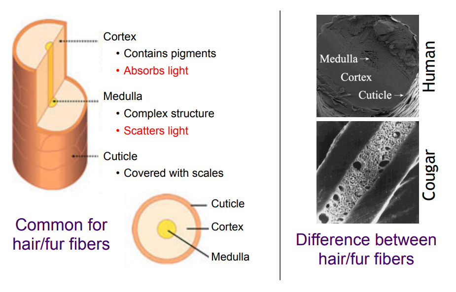 但区别在于,头发中Medulla非常纤细,而毛发中的Medulla则要粗很多,这意味着光线在毛发中更容易发生散射。