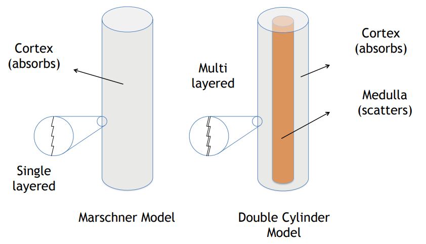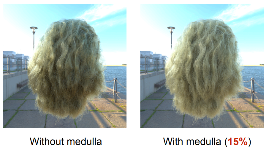 之前的Marschner Model还没有考虑到这个问题,通过引入Medulla,毛发的渲染会更加真实: