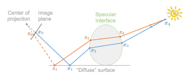 第二阶段,我们从相机出发,生成半路径,同样也是正常进行反射和折射,直到接触到Diffuse表面。