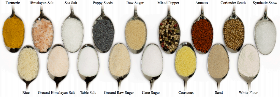 这里我们要研究的是由一堆颗粒堆积而成的材质,下图展示了很多颗粒材质,包括盐、米、面粉等等。