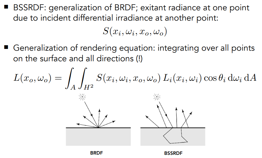 次表面散射模型使用BSSRDF(Bidirectional Subsurface Scattering Reflection Distribution Function)来进行描述,这其实是对BRDF的扩展。BRDF中,我们只考虑方向,因为我们默认入射点和出射点是一致的,而在BSSRDF中,还要考虑出射点的位置: