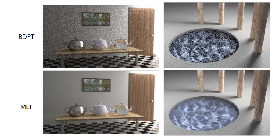 上图中可以看出,在更复杂的场景下,MLT会有更好的表现。因为MLT只需要一条正确的光路作为种子,就可以源源不断地形成新光路。