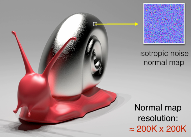 上图使用了200K*200K的法线贴图进行渲染,在蜗牛壳上出现了非常好的效果。