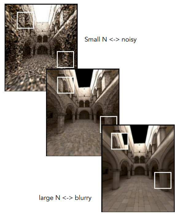 显而易见的是,N的取值会大大影响最后的渲染效果,如果N的取值较小,会导致更多的噪声;反之若N取值过大,会导致模糊。